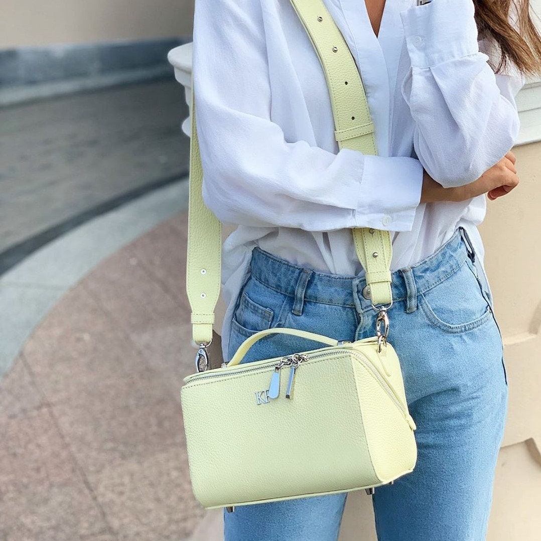 Yellow genuine leather woman shoulder bag from ukrainian designer Katerina Fox. Fashionable and elegant modern bag KF for bright girls and women. This bag is able to attract attention and highlight your exquisite taste. The internal space of a bag is equipped with one spacious compartment and one zipper pocket. The bag is closed with a zipper. The length of the strap is adjustable. The kit also includes a storage bag.