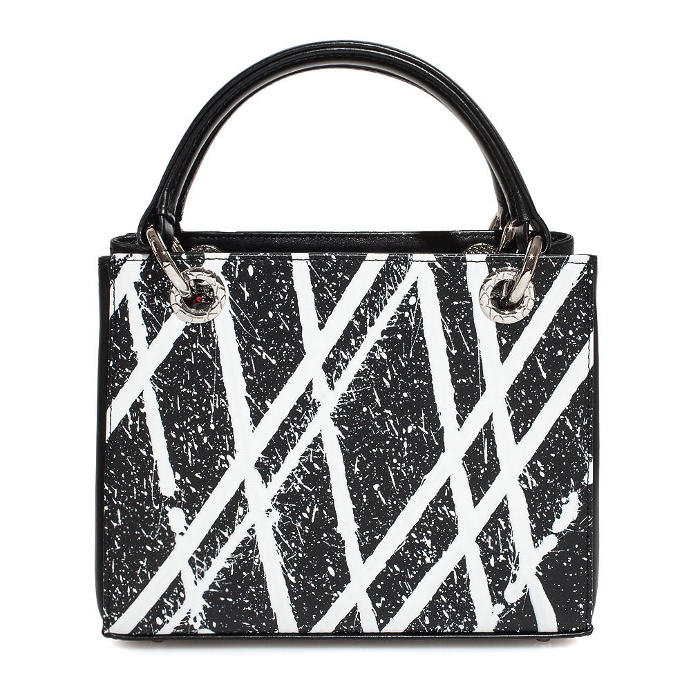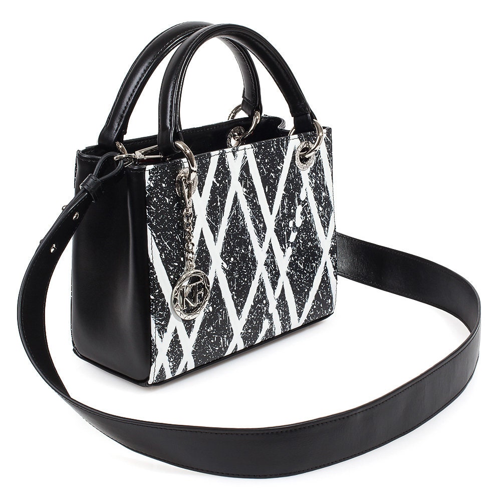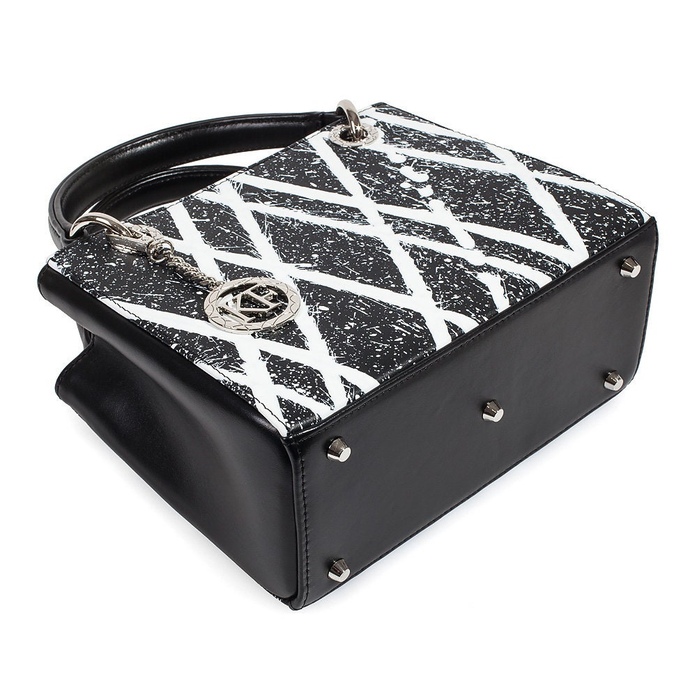 Delivery: In most cases our goods are shipped by FedEx or Ups Express. On rare occasions the goods might be shipped by Ukrposhta. The clients should check in advance an estimate of the amount of customs duty and value added tax.Black-white genuine leather handbag from ukrainian designer Katerina Fox. This model is designed for women who appreciate the sleek design combined with functionality and comfort. Despite the simplicity, this bag stands out thanks to a triangular insert in black suede leather. High-quality and reliable hardware ensure long service bags. Inside the bag are three spacious compartments, one with zip, two patch pockets and one zippered pocket closes with a zipper. The bottom of the bag protected by metal feet.